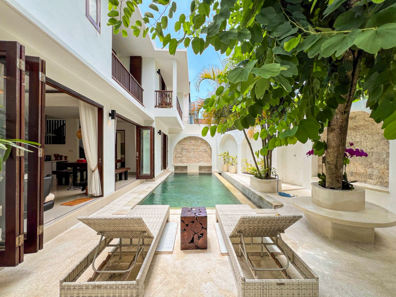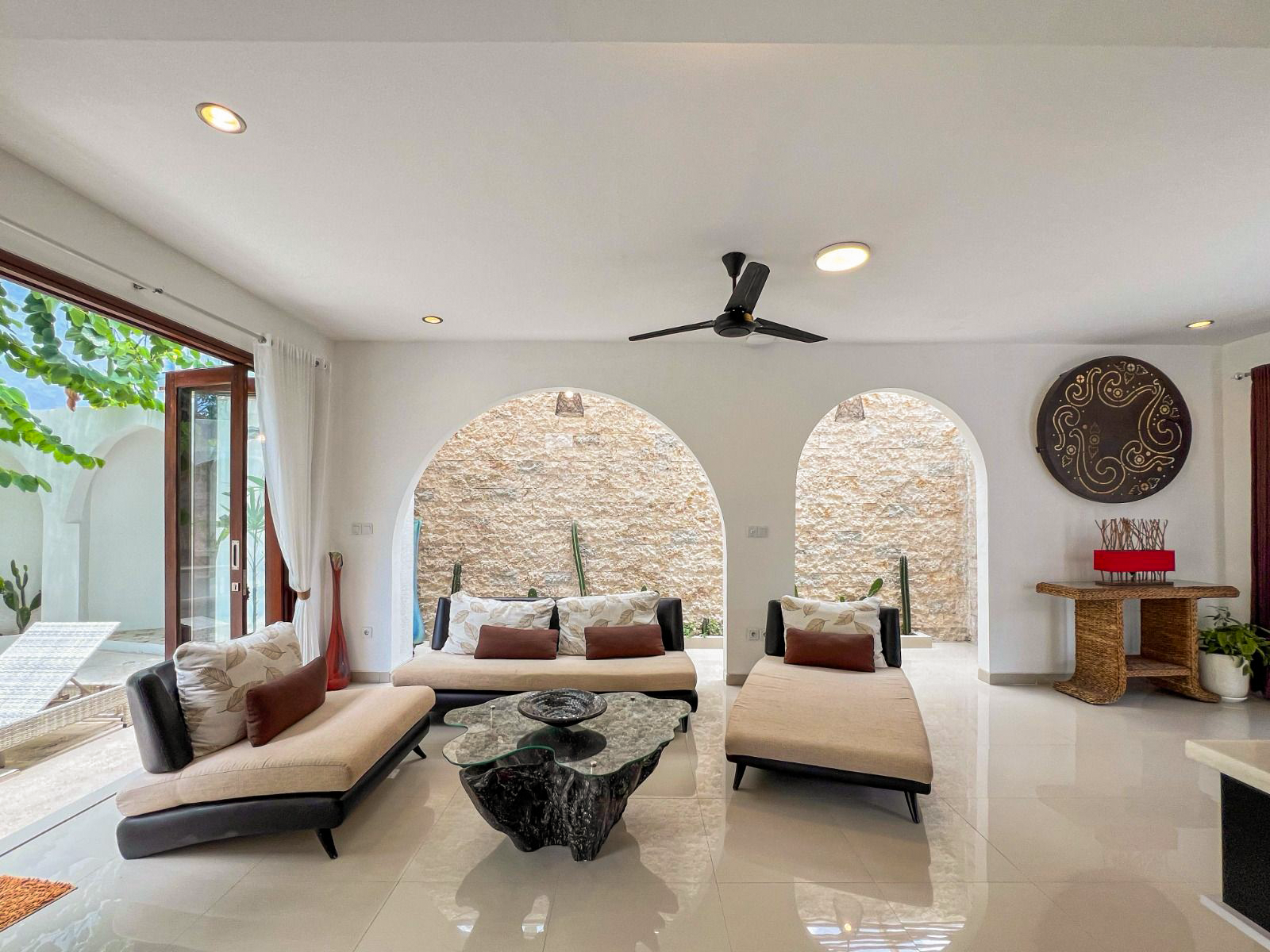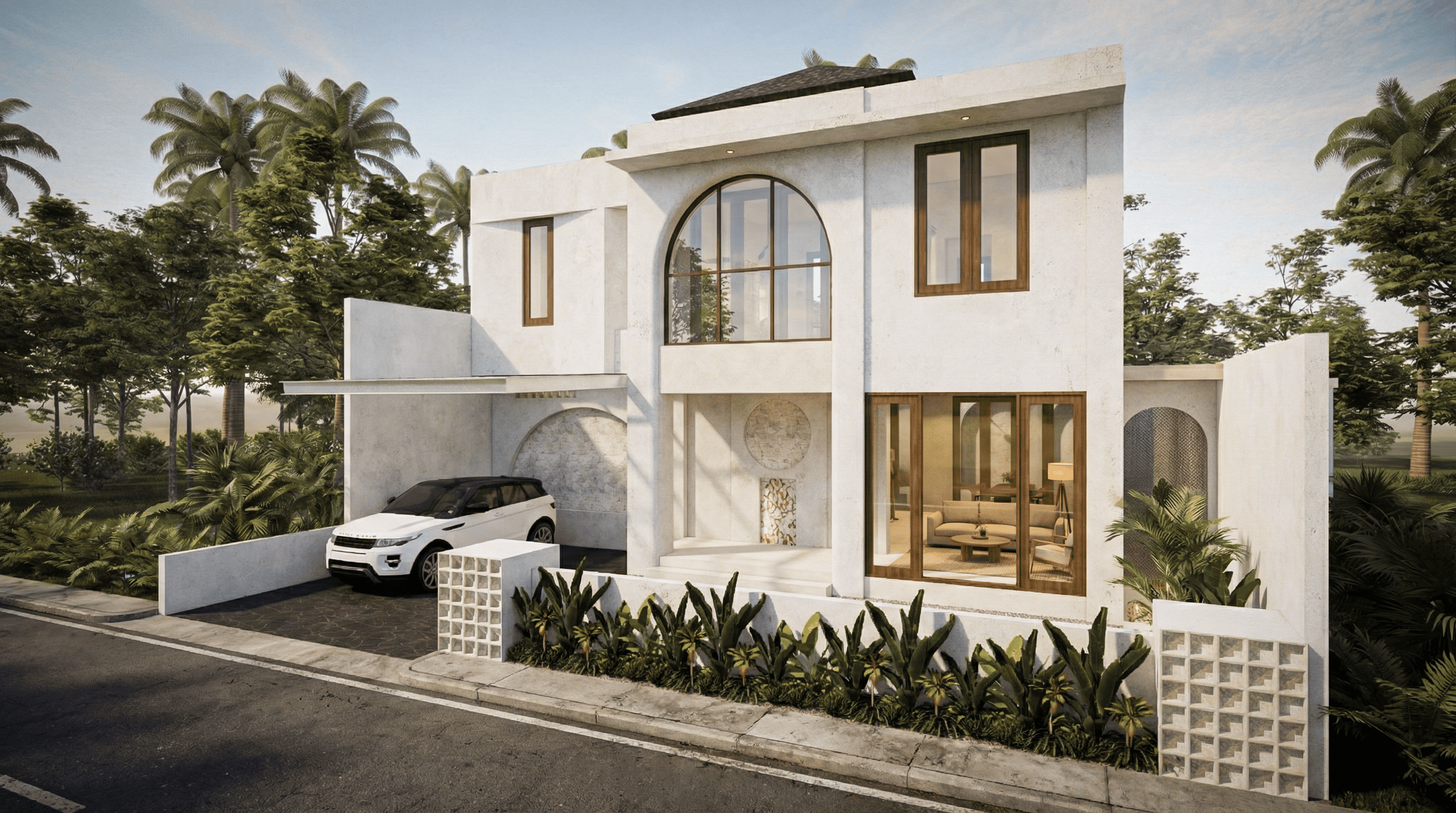 Featuring textured white plaster walls, iconic arched openings, and natural materials, Nata-T House offers a timeless architectural identity with strong visual appeal. The layout is optimized for natural daylight and cross-ventilation, creating bright, airy spaces well-suited to Bali’s tropical climate.